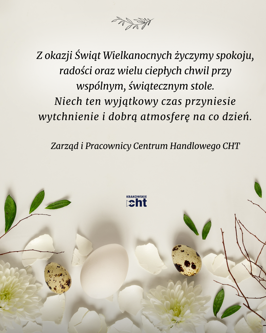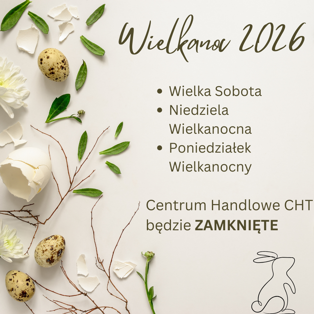 Nasze Centrum Handlowe CHT będzie nieczynne w: • Wielką Sobotę • Niedzielę Wielkanocną • Poniedziałek Wielkanocny. W pozostałe dni zapraszamy...